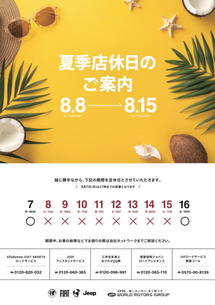平素より、フィアット/アバルト山口をご愛顧賜りまして、誠にありがとうございます。誠に勝手ながら、下記の期間を夏季休暇の為店休日とさせていただきます。2023年8...