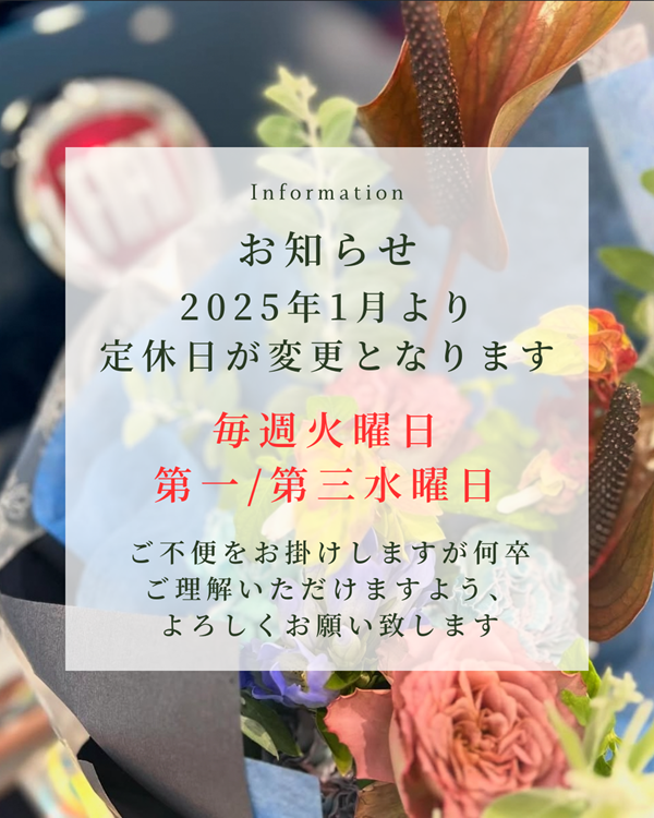このたび、誠に勝手ながら下記の通り定休日を変更させていただくこととなりました。